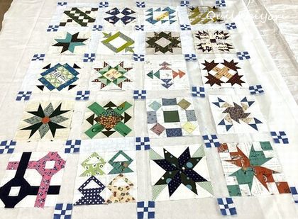 岡輝公民館のWさんのサンプラーキルトはラティスのナインパッチもそろって、前回だいたいの配置も決まりました。明るめの生成りでまとめたので爽や···