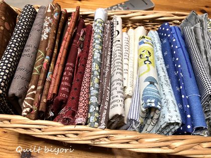 丸のアップリケを作りためるために布を少し選びました。バッグを作るつもりです。だいたいの雰囲気でとりあえず選んで籠にまとめておきます。あとは···